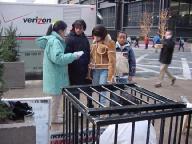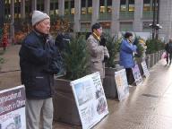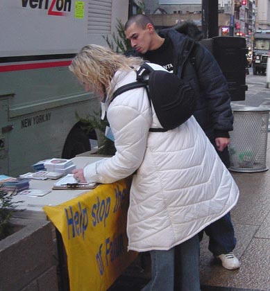 现在接资料的人越来越多,特别是白人接的很多,有些白人看展板,站在那里长时间听学员讲真象。早上我们在世贸中心打出的横幅:“很多你们的中国同事被蒙骗,并帮助传播中国共产党的谎言,不要被他们的话误导,你自己去看法轮功的真实故事。”几乎所有的白人路过时都看,接资料的人也很多。