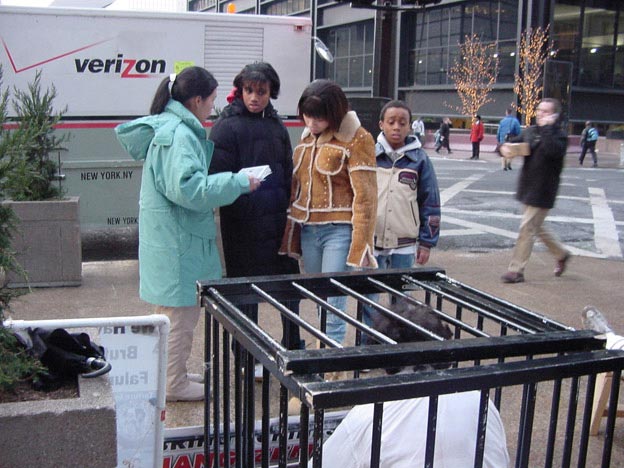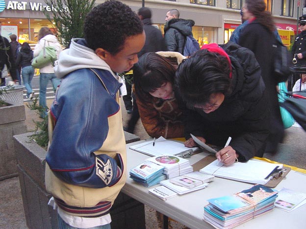 有一次,有个白人妇女问学员,你们这样做到底想得到什么。学员告诉她,第一,我们希望更多的人与我们一起共同制止这场在中国发生的迫害,因为这场迫害是反人类的。第二,我们这样做,得到了很多美国人的支持,签名,写信,告诉亲朋好友,引发了许多人的善念、善心,这对这个社会大有益处,我们的社会太需要人们的善心和帮助他人。她听了以后,好象很能理解,不住的点头表示同意。