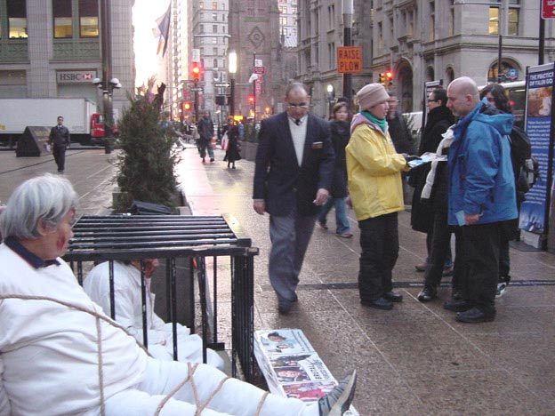 有两个西人,来到学员演示酷刑的前面,听了学员向他们讲真象后,流着眼泪,要站在演示酷刑的学员旁边照相作为纪念。还有两个路人,看见酷刑演示,一个就开始严厉的指着演示警察的学员说,你怎么能把她们折磨成这个样子,另一个就要动手打那个学员。