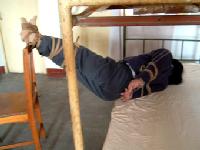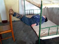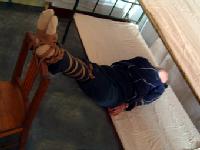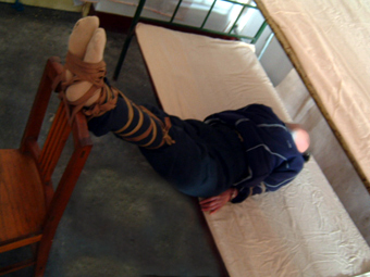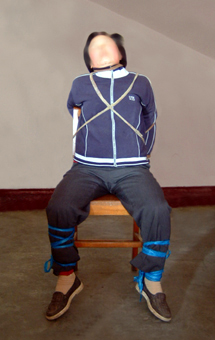 济南监狱的恶人们在晚上将李秀珍用铐子铐住,再用绳子绑,胳膊、腿都绑起来,扔在木板上,让李秀珍的上半身在木板上,脚绑在椅子上,中间腰部悬着,那痛苦无以言表,李秀珍是一秒一秒强挨过来,每一秒的艰难使李秀珍痛苦的感觉刻骨铭心!犯人王成爱还踩李秀珍的肚子,踢头,李秀珍常常被她们打得昏死过去。