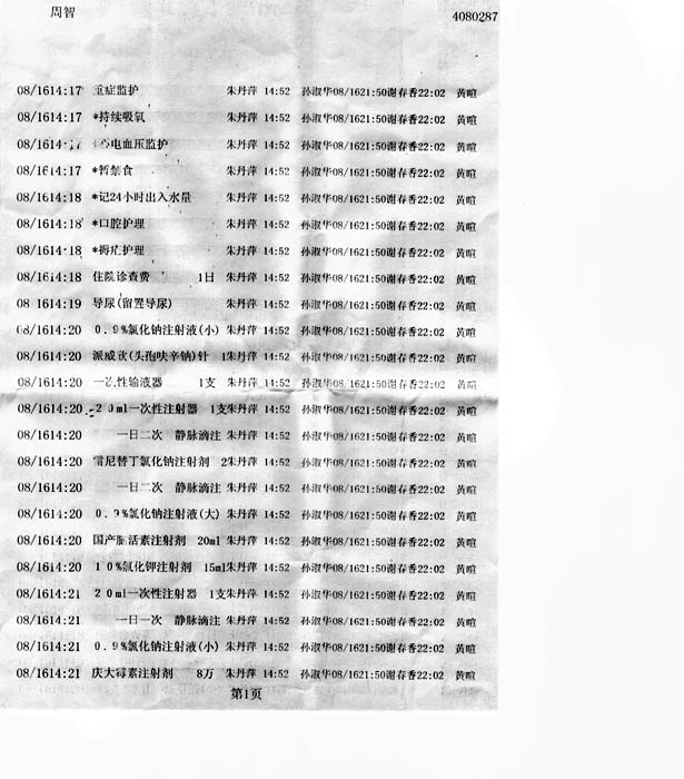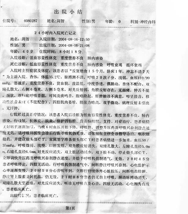 没想到8月16日我到监狱医院看到周智已是神志不清,下身尿湿一片,无人管。我对身边一个护理的人说:好好照顾照顾他吧。可他说:我们每天只给他换一次。我又找到李大队长,对他说:人都这样了,怎么还不转院治疗啊!他说正在研究。最后到了下午,在我的一再追问下,同意转到739医院。当时周智已经休克2天,瞳孔放大,肺有炎症,且肺积水(原来干瘪的肚子已鼓起)。家属要求全力抢救,终因时间拖的太久了,已经晚了,抢救无效,晚6点血压下降,9点心脏停止了跳动。