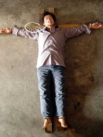 寒亭看守所用三块20公分宽的长木板(两竖一横)钉成“十字架”,恶警们将大法弟子两脚锁着,两手铐着,扣铐在“十字架”上。由于三块板不在一个面上(横板放在竖板上),人成“丁”字形躺在上面高低不平,头往后耷拉着,脊椎骨被往上突出的那块木板顶着高高的,身子一动也动不了,不一会,全身就疼痛的昏死在上面。平时放在地上,人要吃饭、大小便时,就将“十字架”竖起来。