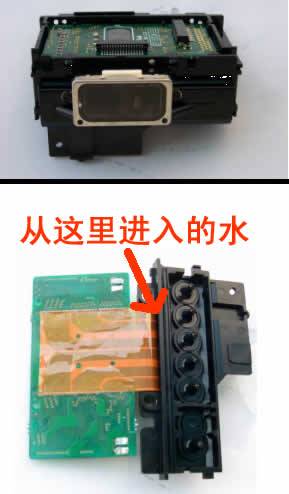 泡喷头时已经注意了,水比较浅,没有淹到喷头电路板,水从何来?——我们还是把喷头上面取下,这样可以更清楚;注意看这块电路板的连线已经插到喷头中间去 了;其实喷头中间完全为空,里面可以装几毫升墨水。只要喷头中进水,在装入打印机时候,稍不注意喷头倾斜,就会造成电路板短路。还有很多人有甩喷头的习惯,以为甩就能甩干,这一甩,会把喷头中的水甩来往上走,使电路板短路。