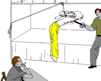 这是吉林省朝阳沟劳教所对“不决裂”的大法弟子施加的一种酷刑:吊飞机。将大法弟子双手倒背剑式绑在背后,用绳子吊在二层铺的横梁上,使两脚尖刚刚离地,身体的重量全部承载在两个手腕上,衣服搂起套在头上,用电棍电击腋窝,腋窝触电的每根汗毛连动全身,一阵抽动,痛苦无法形容。一处击焦、击煳后再换一处,直到人不省人事才放下来。但多数大法弟子放下来时,胳膊已被掰断。