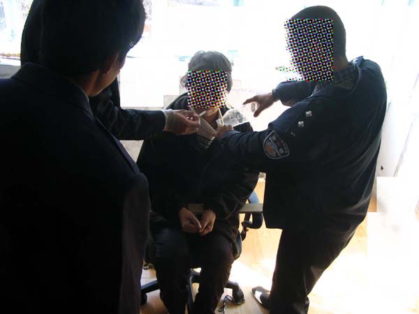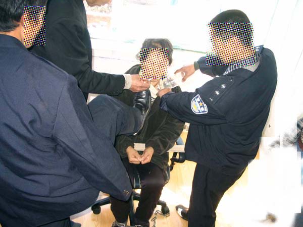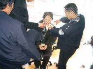 到公安局后,他们把我上衣脱掉,戴上手铐,三个人审我。石海林拿电棍电我的脸、手、脖子;有一个人拿“小白龙”,掀起我的衣服专往我的腰上打;还有一个人在那助威,告诉石海林往敏感部位电。他们逼问我:“你和谁联系?给×××打电话没有?”我一概不配合,一直发正念。两小时后,我的脸上被电得都是小硬疙瘩,腰部打成黑紫色。过一会儿,他们见我不说,就把我的手反背扣上手铐。然后,他们拽手铐往下按我,叫我低头。那时,两只手铐象卡進肉来一样钻心的疼,后来就没知觉了。他们看实在问不出什么,就把我送進拘留所;18天后,又把我转到看守所;26天后,把我非法劳教一年,送進长春市黑嘴子劳教所。