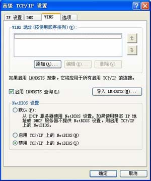 另外,通常在 TCP/IP 协议上实现了 NetBIOS 协议,需要去掉。从网络连接【属性】中选中 “Internet 协议( TCP/IP )”,点属性進入 【Internet 协议(TCP/IP) 属性】设置,点高级進入 【高级 TCP/IP 设置】,点 WINS ,禁用 TCP/IP 上的 NetBIOS,如下图。
