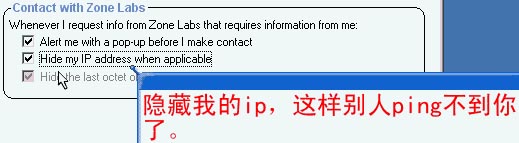 2. 闪画讲到选上“Hide my IP address when applicable”可以使“隐藏我的ip,这样别人ping不到你了”,我认为不妥。可能是作者没有注意到它的前提:“Contact with Zone Labs”和“Whenever I request info from Zone Labs:”,也就是“在与Zone Labs网站联系时”和“任何时候我从Zone Labs 请求(获取)信息时”,在这种情况下“如果可能的话隐藏我的 IP”,换句话说就是:“尽量不向 Zone Labs 暴露我的 IP”。