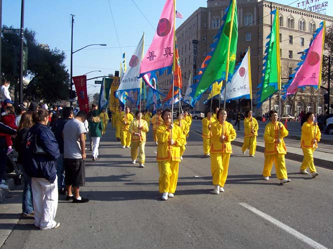 当法轮功的队伍经过主席台时,主持人跟另一个主持人确认了法轮大法的正确英文发音后才认真的读出来,他说,“当我读到法轮大法这几个字时,就能感到这几个字能带给人们内心的祥和。”他向观众说,“欢迎法轮大法的队伍。”