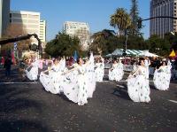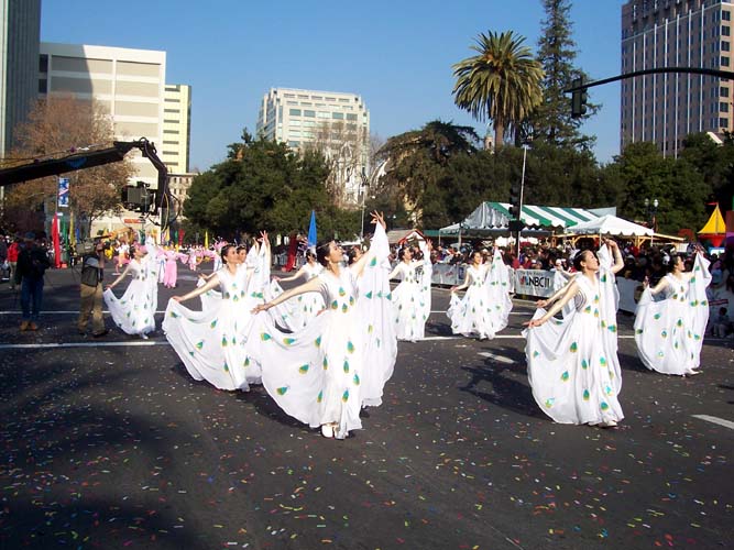 一大早,圣荷西纪事报的记者就来到法轮功游行队伍的花车前进行拍照。今年的游行与往年不同,洛杉矶的学员特地将他们多次在游行中获奖的花车开来支持此次的游行。除了造型豪放别致的花车外,法轮功学员还为观众第一次带来了真善忍旗阵、民族舞蹈、舞狮,以及彩带舞、灯笼舞和令观众耳目一新的腰鼓舞,法轮功的功法示范、祥和的音乐、色彩鲜艳的服饰,为圣荷西带来了特殊的节日气氛。
