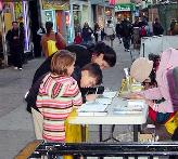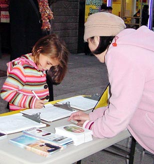 一位妈妈带着两兄妹经过这里,妈妈和哥哥都签了名,然后拉着小妹妹就走了,小妹妹挣脱妈妈的手,跑回来签了名。