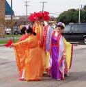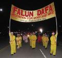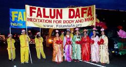 高高举起的黄色、蓝色写有“FALUN DAFA”的横幅,身着金黄色炼功服,再加上几位端庄、典雅身着华丽唐装女士们组成的法轮功学员的队伍在各个城市的游行中都是那样的醒目。