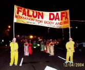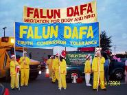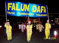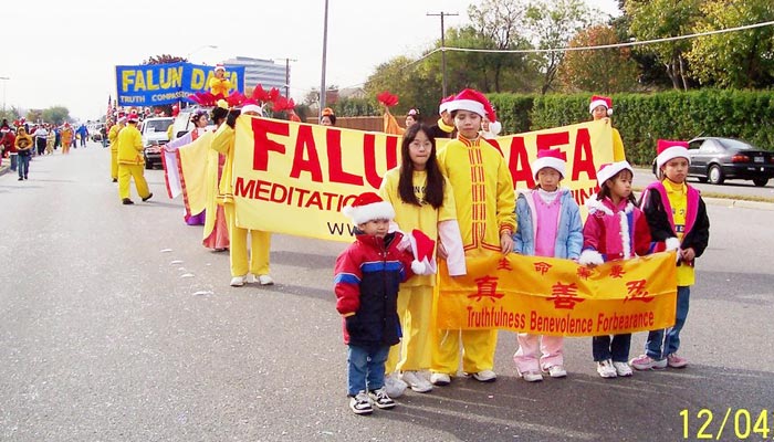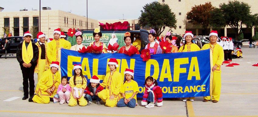 2004年12月4日,星期六上午,在Coit大道上举行的李察逊市圣诞节游行今年已经是第三十三届,共一百三十多个团体参加了此次游行,路旁边很多人们都已早早的等在那里观看,法轮功学员的队伍赢得了人们的热烈掌声。发资料的学员都忙不过来,几乎每个人都要资料,发资料学员非常珍视人们了解真象的机会,为了满足每个人要法轮功资料的愿望,他们远远的落在自己队伍的后面。下午,学员就接到主办者的电话,法轮功学员的队伍获得成年步行组的第一名,晚间学员在颁奖仪式上领取了奖杯。