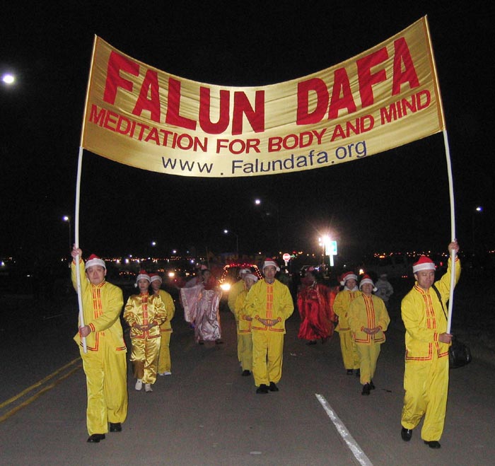 同日的傍晚,学员们又开车1小时赶到阿灵顿市(Arlington)参加那里的圣诞灯光游行。组织者对法轮功学员参加去年的首届游行记忆犹新,学员们在停车场做准备工作时,他特意找到学员表示感谢和欢迎学员们再次参加。法轮功学员李先生告诉记者:“今年的阿灵顿市游行设有两个主席台,当我们经过第一个主席台的时候,主持人先介绍了法轮大法,然后他又让观众们一起学着说‘法轮大法’。在舞蹈队的女学员随着‘法轮大法好’的歌声,手持莲花表演的时候,这位主持人又风趣地让大家一起跟着唱‘法轮大法好’。”