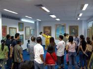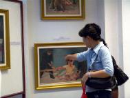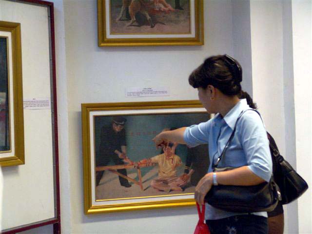 ![]() 两位小弟子演示5套功法 | ![]() 一位母亲边指着画,边向她的孩子解说恶警对修炼人施暴手段 | ![]() 占特拉画展展厅外貌一瞥 |