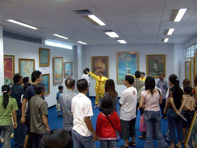 整个展所洁白的壁上,挂满35幅大小不同的艺术画,分为:天人合一、无名苦难、坚忍不屈和正义必胜四个部分。画技生动玄妙,吸引络绎不绝的民众的前来观看。来的绝大多数是华裔居民,法轮功学员们耐心的给观众讲解真象。人们对画展有浓厚的兴趣,因为这样的画展还是第一次见到。