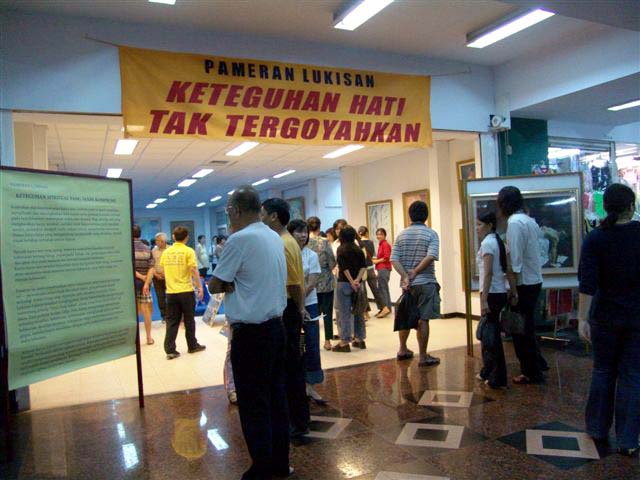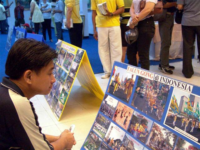 ![]() “坚忍不屈的精神”艺术展轰动雅加达唐人区 | ![]() 年轻人专注的观看法轮功在印尼洪传的展板 | ![]() 来观画的有缘人不分男女老少 |