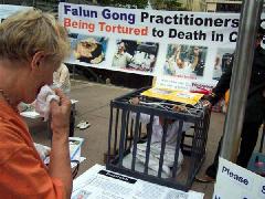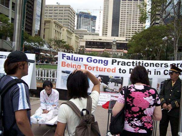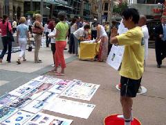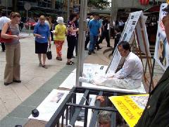 有一位瘦小的老年妇女非常仔细的观看了每一张图片,并和学员谈了很久,签了名还久久不愿离去。第二天一大早又来和学员交谈了很久仍依依不舍 。有一位行人还买了矿泉水送给作酷刑展的学员。签名的行人络绎不绝。很多人关心的向学员了解真象并表示愿意帮助,有的人拿了多份资料说是要让亲朋好友也知道在中国发生的这场迫害。