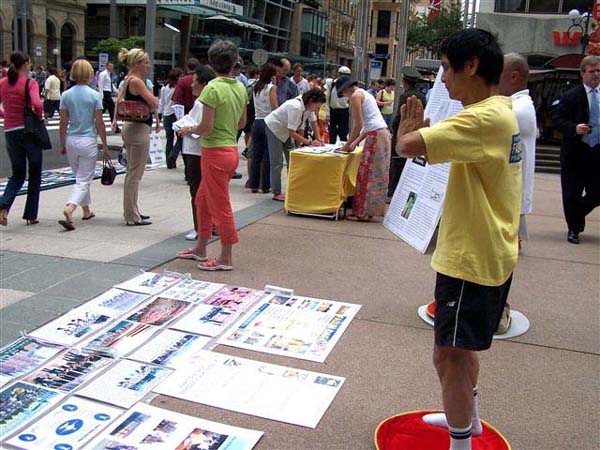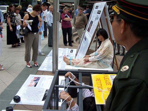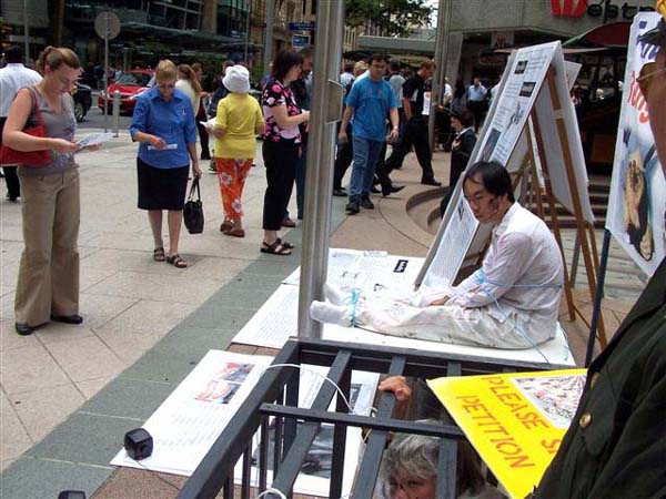 在真人模拟反酷刑展、功法展示以及发资料、讲真象等一系列活动中,学员互相配合协调,形成了强大的、非常祥和的能量场。吸引了无数行人驻足观看。人们的目光由吃惊到认真观看,进而脸上流露出悲伤和同情。接着主动询问学员详细情况,然后走到征签桌前签名支持反迫害。