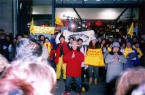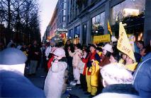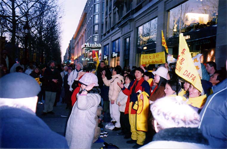 在听闻将有大量的中国人抵达香榭大道,为了让更多的人了解真相,我们约有数十人在一月廿五日下午约四点前往,希望能有机会与广大的华人接触、。同修在散发传单与光碟时,索取的民众络绎不绝,中文的发完了就给英文的,最后连书签也发得所剩无几。周遭的西方人也好奇地伸手过来,想看看到底这些面容和详、热诚善意的人传布的是什么资讯?有的中国人在前面不敢拿,到了人群后面才悄悄问其他学员还有没有?有的则一定要中文的,开心地说谢谢,攒在手里或是在路边就认真地读了起来。印象最深的是有一位新近迁入法国当地的中国人,急迫地问我们何处可以找到炼功点?如果今天打电话,能找得到人吗?