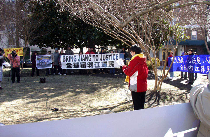 华府法轮功学员于2004年2月13日中午在中国驻美国大使馆前举行新闻发布会,并且打出“法办江泽民、罗干、刘京、周永康”,“严惩江泽民”,“道义法庭、人心法庭、人间法庭全球公审江泽民”等横幅。