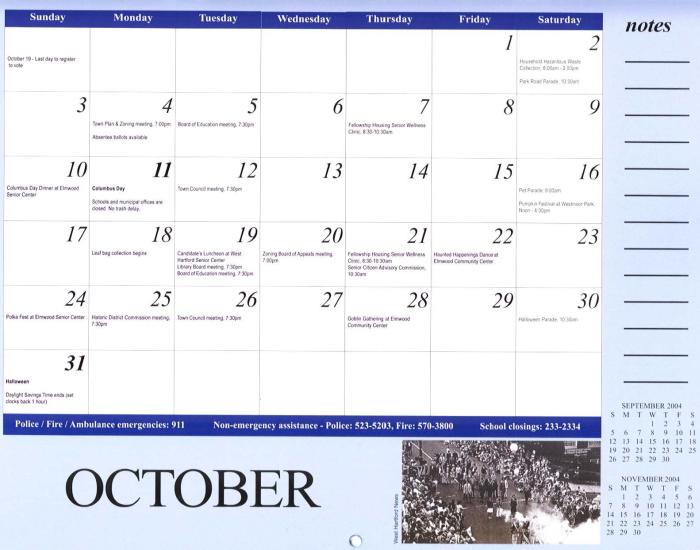 这个2004年历10月份的主题是“今与昔:游行”,以法轮功学员的表演体现今日该市游行的风貌,并在月历右下角配旧日游行的黑白照片以作为对照。这真是:法轮旋转处, 万象更新时。