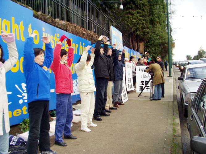 2月14日是西方的情人节,到处充满着温馨的气息。而温哥华学员站在车水马龙的领馆前坚持在寒风中炼功、发正念。法轮功学员李婴说,江氏的这场迫害在中国造成了无数的家庭家破人亡、妻离子散,年轻的妻子失去了丈夫,年幼的孩子失去了妈妈,江氏的监牢里不仅关着七、八十岁的老人,甚至还有吃奶的婴儿。被关的理由仅仅是因为他们信仰真、善、忍,而被奉行假、恶、斗的江氏所不容。