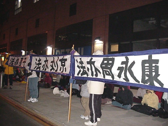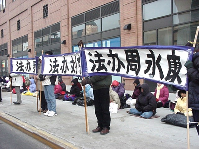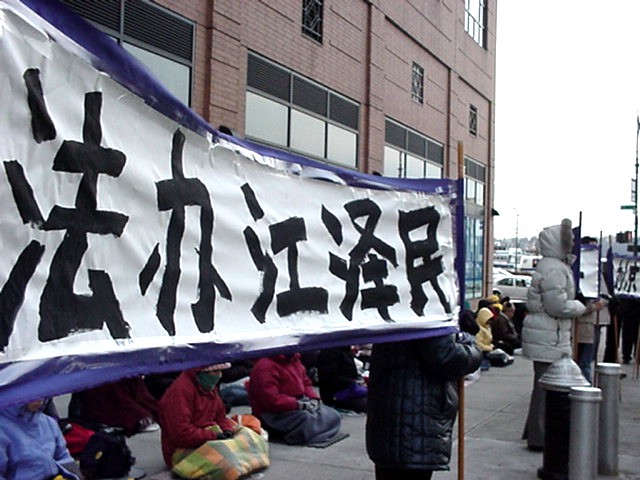 纽约法轮功学员们表示, 原中共中央总书记江××是这场镇压的策划和命令者,江出于对上亿人的炼功团体和他的创始人的嫉妒和胆虚,发动了这场荒唐而又灭绝人性的镇压。而罗干(中央政法委书记,公安部副部长)、刘京(「610」办公室副主任)、周永康(公安部部长)则是具体实施江××灭绝法轮功团体之政策的帮凶。