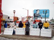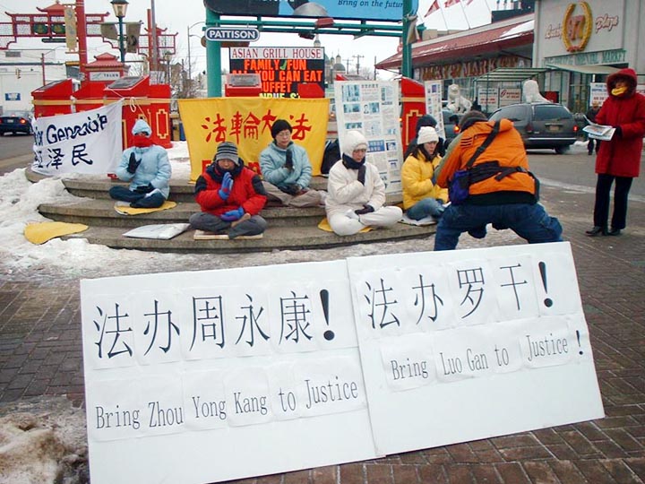 【明慧网2004年2月16日】[明慧记者爱民顿报道]2月14号下午2点到4点,加拿大爱民顿市法轮功学员聚集到中国城,在零下十几度的风雪中举行新闻发布会,并打出“公审江泽民”的横幅,以及“法办江泽民”、“法办罗干、刘京和周永康”、自焚真象等展板,声援在中国大陆的法轮功学员,呼吁停止迫害。发布会结束后,学员们继续发正念,并向行人讲真象。
