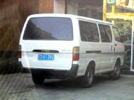 临海大酒店院门入口处院内通往酒店的门口停着一辆白色金杯面包车车号:辽O-B1392,此车是这个邪恶窝点的专用车