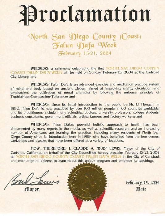 鉴此,我,克劳德-“巴特”-路易斯(ClaudeA. “Bud” Lewis),加州卡尔斯贝市市长,代表市议会宣布2004年2月15-21日为卡尔斯贝市“北圣地亚哥县法轮大法周”,并鼓励所有市民学习这一独特功法,拥戴他的教导。