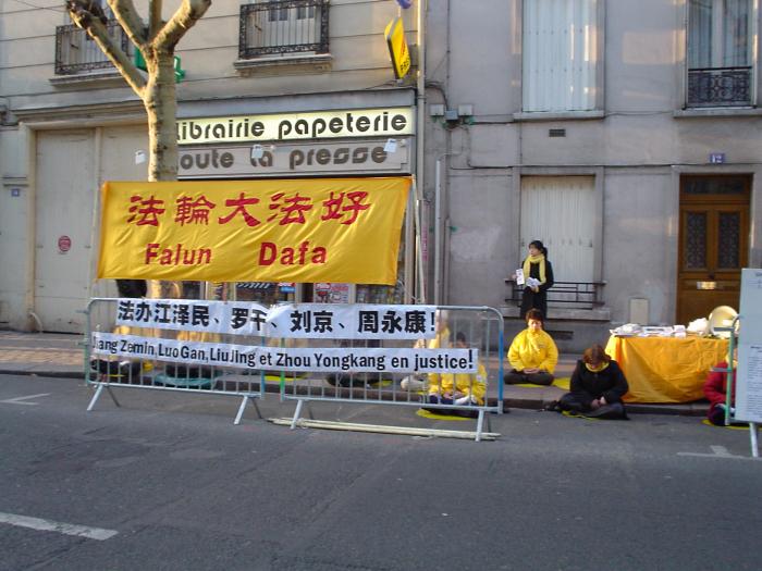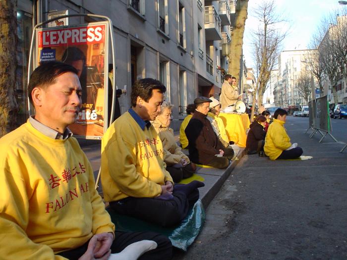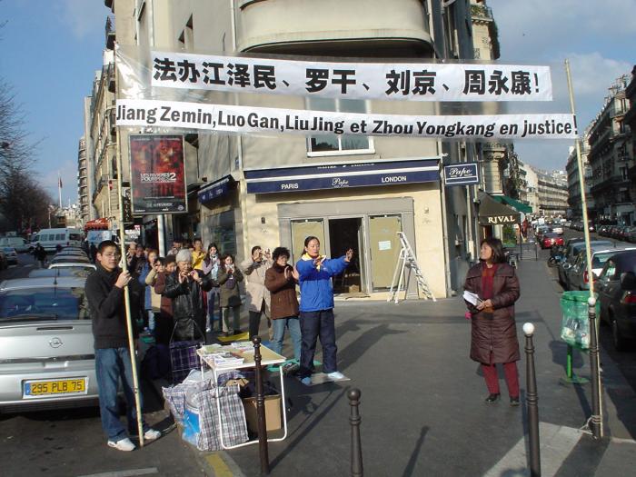 【明慧网2004年2月19日】2月16日下午,法国大法弟子分别来到中使馆和中领馆和平请愿,抗议最近江泽民集团对法轮功学员的抓捕、虐杀的加剧,要求法办对法轮功学员犯下累累血债的江泽民、罗干、刘京、周永康。它们的罪行包括杀害、