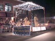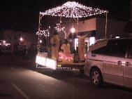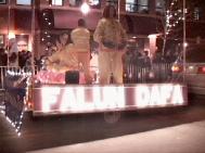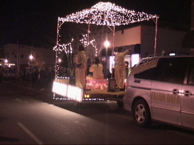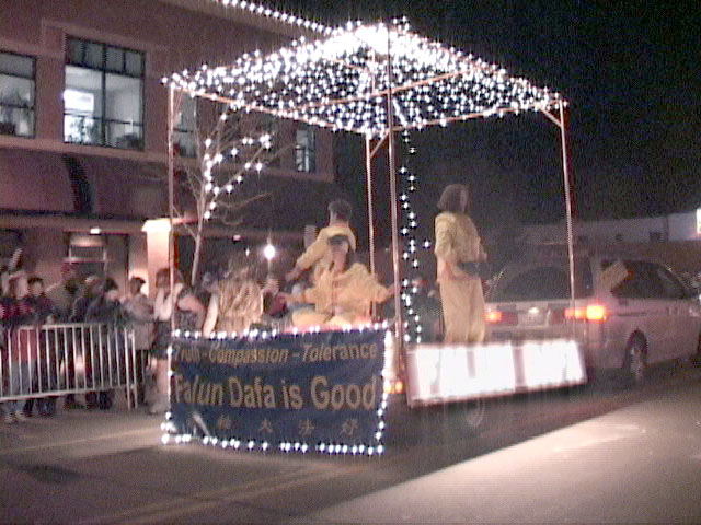 这是学员们第一次参加灯光游行,为了让更多的民众了解法轮功,学员们自己制做了灯光花车, 包括灯光莲花, 灯光横幅等,三位西方弟子在花车上的功法表演最为引人注目, 其余弟子则在寒风中分发法轮功真相资料。