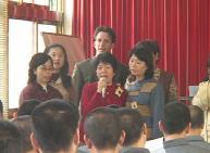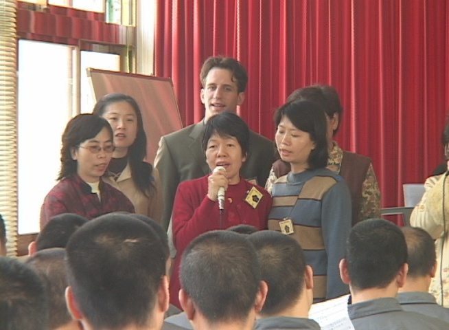 | 泽农对狱中受刑人讲述修炼后重生历程 | 法轮功学员为受刑人演唱悠扬的歌曲 | 受刑人和泽农握手道别 |