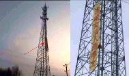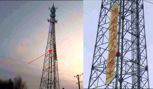 挂条幅:有人请一位老太太将条幅转交他人,这位62岁的老人家冒着凛冽的寒风,用了两个半小时,将条幅挂在此塔上。该塔60~70米高啊,老人家您受累了,不过以后这样的事还是让给年轻人做吧,大家各自发挥各自的长处……