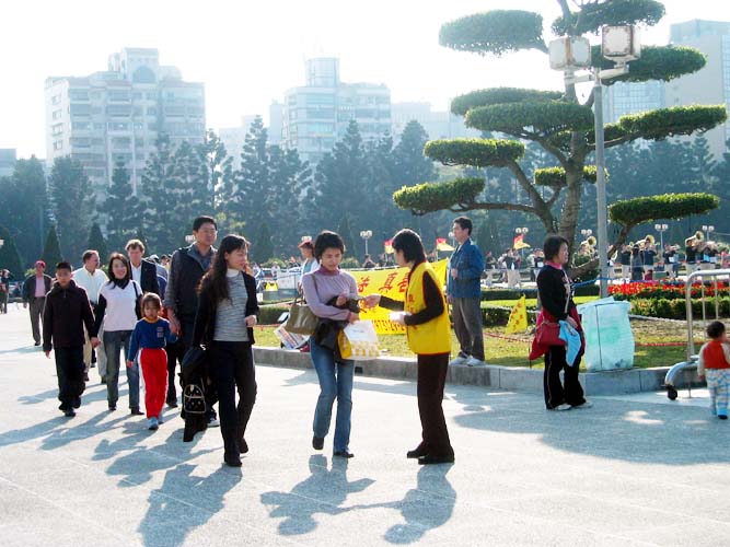 | 学员在中正纪念堂前炼功、洪法 | 让更多游人了解法轮功真象 |