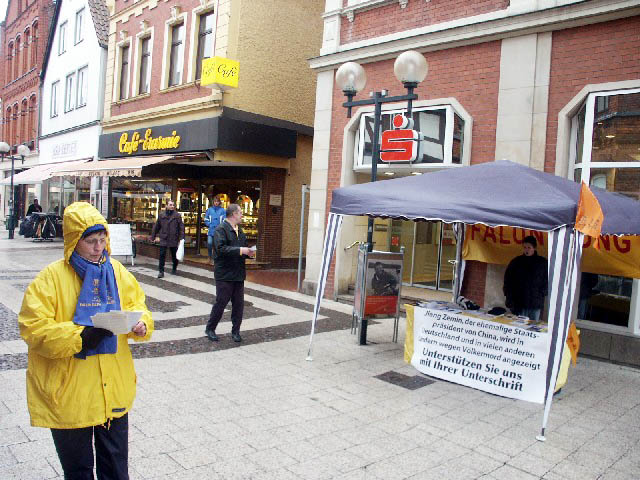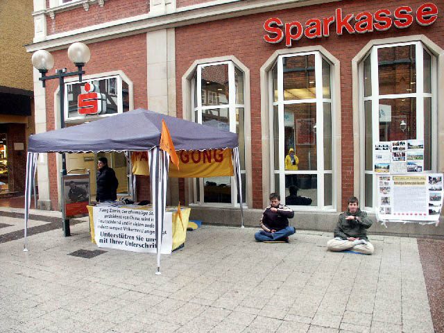 报道说昨天尽管天气很冷,而且还下着雨,不来梅的法轮功小组还是在费尔登的步行街展示表了功法。Tina 和Sebastian 强调说:“我们想通过这个活动让人们了解在中国1亿法轮大法学员被迫害的真相。”另外,法轮功修炼者还发起了征签活动,让人们加入对中国前国家主席江泽民的控告,他被指控犯有群体灭绝罪和反人道罪。(……)