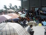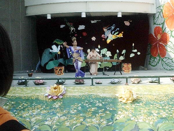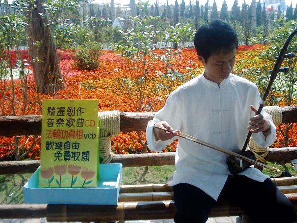 在凉亭表演方面,则属双人国乐演奏,在人来人往的走道旁,二胡和箫的合奏,使不少路过的民众好奇的停下脚步,并且主动拿走音乐光碟以及法轮功真象VCD。法轮功学员在表演时除了赠送法轮功真象光碟,音乐光碟以外,也发送气球给小朋友,不长时间花博会会场随处可以看到印有法轮大法好的气球,让花博会增色不少。