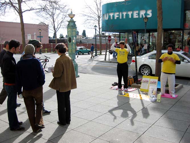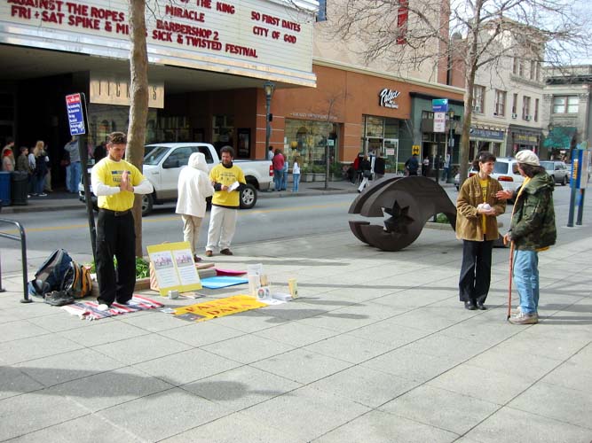 2004年2月21日中午,美国堪萨斯州学员们来到堪萨斯城著名的景点之一的“ 广场喷泉公园”向公众征集签名,营救法轮功学员李祥春。几乎每一位行人都接过了我们的签名卡,以及真相资料,并祝愿祥春能早日回归。许多过路人还表示希望能够早日将镇压法轮功的元凶绳之以法!