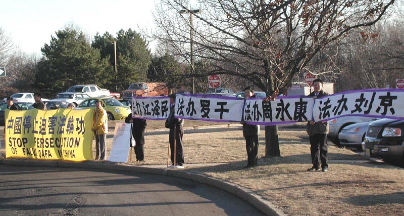 2月23日当天,20多位法轮功学员展开“石家庄14位法轮功学员被迫害致死”、“停止迫害法轮功”等横幅,静静地站在爱迪生市市府外,期望能让到访的石家庄市代表团看到他们的和平呼吁。