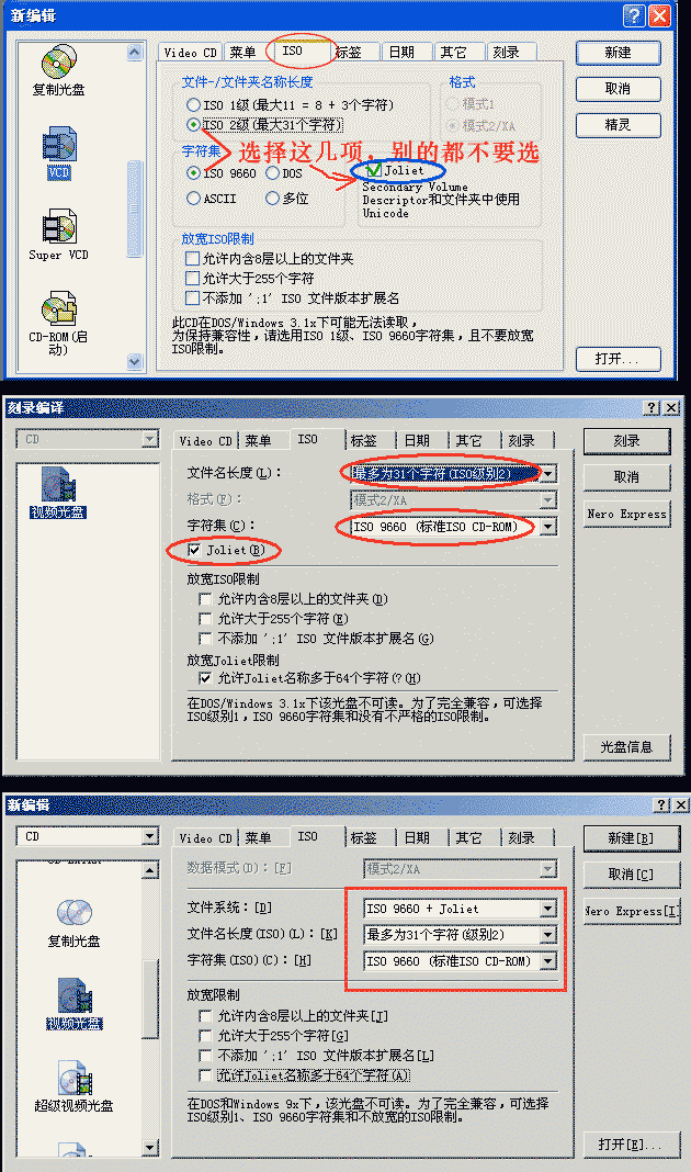 4、在“ISO”标签选项里,选择“ISO2级”、“ISO 9660”和“Joliet”这几个选项(这是最关键的一步,如果不选“Joliet”,中文文件名就不能显示),如图所示,不同的Nero 版本界面略有不同: