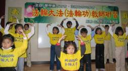 1/27至1/31,台南县及台南市两地同时有亲师生法轮大法研习,台南明慧学校小弟子于研习期间(1/30)上午和下午分别前往研习地点「台南县学甲国中」和「台南市东光国小」表演歌曲及演示五套功法。表演最后,小弟子还准备了「为你而来」这首歌献唱给现场与会人员。当小弟子用心的演唱「为你而来」这首歌时,纯净的歌声和感人的歌词,让现场人员感受到小弟子的心,有些人并举起双手打着节拍,随歌唱和,张口跟着唱出「法轮大法好啊,法轮大法好啊,切莫错过这万古机缘…」。表演结束后,就有现场人员询问有关明慧学校的各项事情,经由会场工作人员说明后,也欢迎大家把明慧学校告诉更多的人,让更多的人知道并参与。