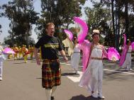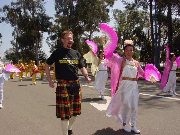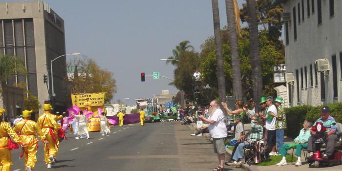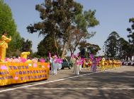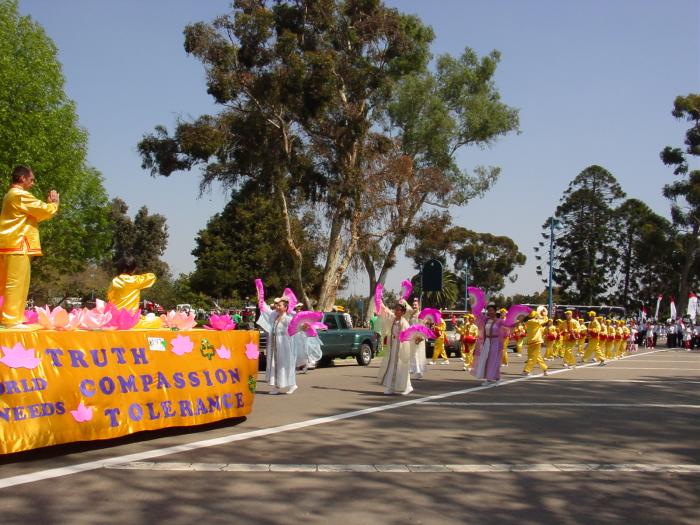 法轮功学员的队伍在整个游行中既壮观又祥和,大家用着不同的方式向世人展示大法的美好。走在队伍最前面的三名中、西方学员举着由中英文书写的“法轮大法”大型横幅,然后是精心装点并获得组委会好评的花车。花车两侧写着“法轮大法好”和“世界需要真善忍”,花车后面是大法网站的网址,车身前方两侧贴有免费教授法轮功的海报。花车上的学员在游行过程中不间断地演炼着五套优美舒展的法轮功功法。紧随花车之后的是由穿中国传统服饰的女学员组成的舞蹈队,在大法音乐的伴奏下翩翩起舞。最后是多次参加过在圣地亚哥市举办的各种活动并应邀出席过洛杉矶地区活动的圣地亚哥腰鼓队。