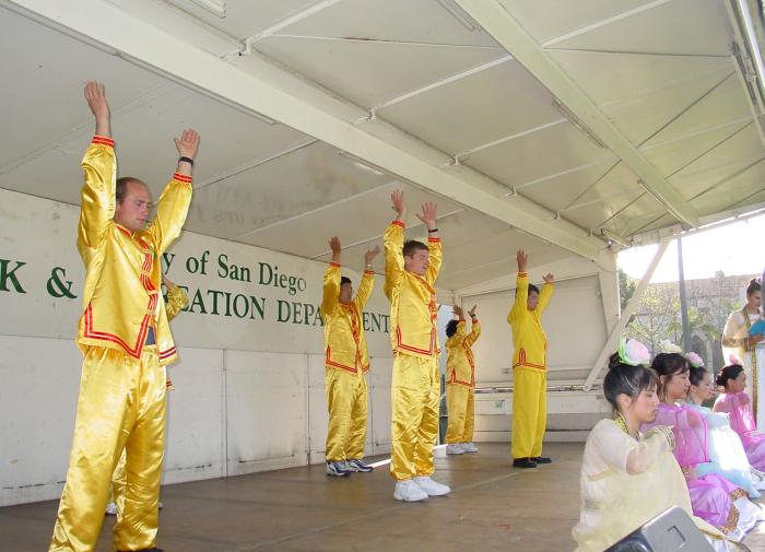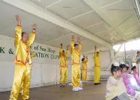 除了参加游行外,学员还在游行后的集会处订了一个展位,一边表演功法,一边向人们介绍大法和讲清真象。另外,十名学员还在市政府所设的临时舞台上向观众表演了法轮功功法。