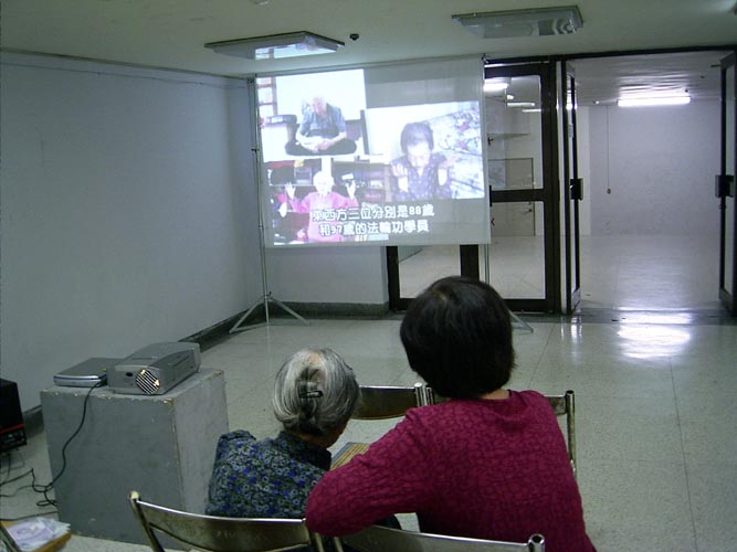 | 台中市议员游民哲先生接受新!唐!人:电视台的采访 | 老奶奶一直专注看着「晚霞满天」,三位老太太的修炼故事影片。 |