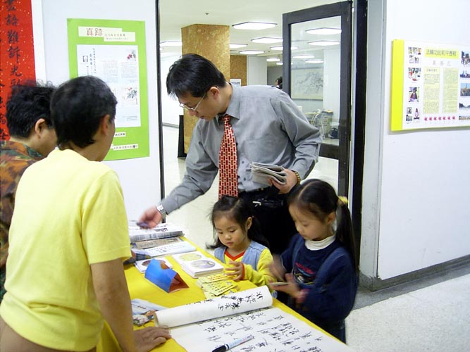| 参观者心喜的签名支持,如获至宝的拿着大法真象资料。 | 参观者专注真象图片 |