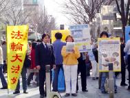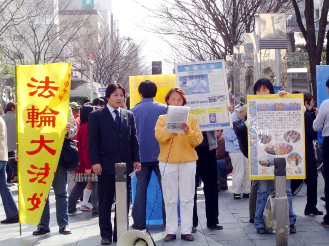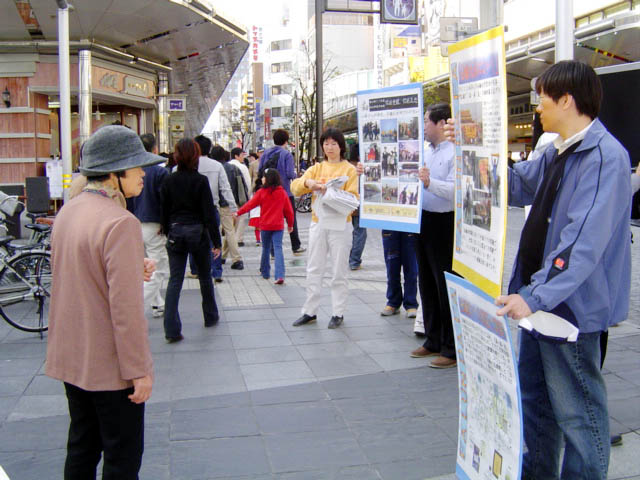 曾因向中国民众讲法轮功真象而被北京警察抓捕并关押一年半的法轮功学员金子容子来到这里向人们致谢。容子被关押在中国期间,为援救容子的征签活动中,有半数以上的静冈县议员伸出援助之手,这里更多善良的民众也配合整个营救活动。容子致谢的同时,也讲述了在中国劳教所里遭受的迫害,一些路人停下脚步观看看板,一些人得知容子回来了,露出了欣慰的笑容。