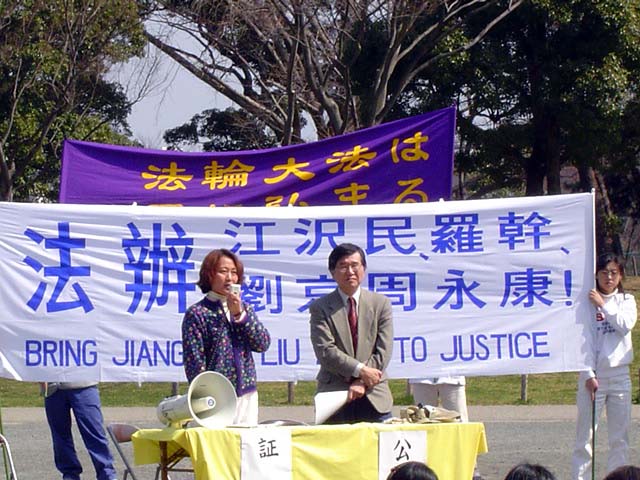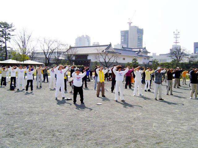 法轮功学员来到静冈县古城遗址骏府公园,首先是炼功,而后是审江大集会。中午休息之后,是反对江氏集团迫害法轮功的游行及在繁华街道演讲同时进行。