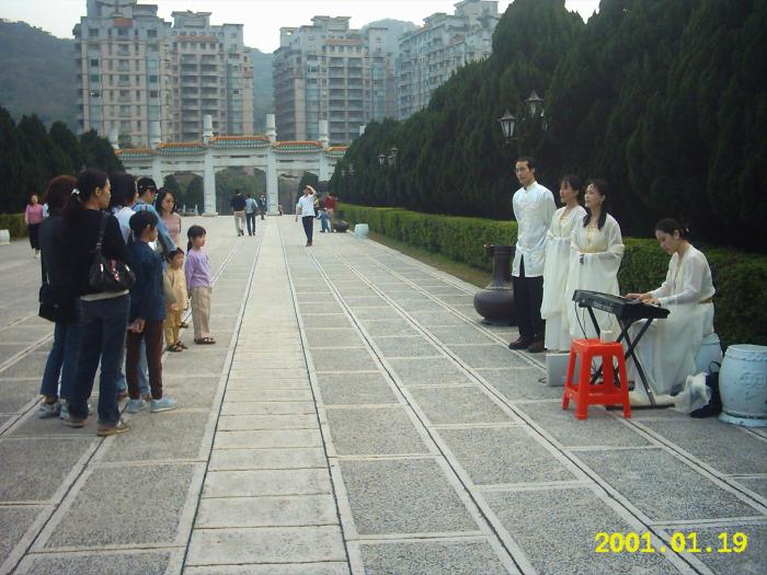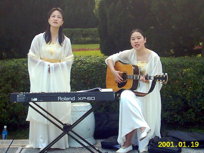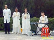 「逍遥心合唱团」的部分成员身着唐装,在故宫下方唱着由法轮大法学员创作的一系列歌曲。他们宁静祥和的神情,及身上素净高雅的唐装,与故宫典雅的景致连成一幅美好的图画。不少游客纷纷按下快门,捕捉这美妙的一刻,还有游客要求和「唐朝仙女」合照;有亚裔游客问这些法轮功学员下回什么时候还会来?是不是每天都到故宫演唱?有游客带着敬意,驻足、凝视着这些法轮功学员,一边看着手上的歌单,一边聆听他们的歌声。