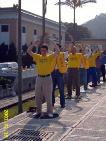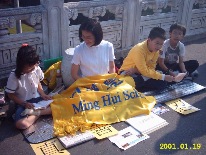 这些小朋友是台北明慧学校「为法来艺术团」的成员。他们跟明慧学校的大姊姊一起背诵着《洪吟》中的诗句。孩子们清朗的声音及纯真的脸庞很快就引起游客的围观,不少游客静静聆听着孩子们朗诵的声音,注视着那颜色鲜艳、黄底蓝字的「明慧学校」横幅,及排在地上的「真」、「善」、「忍」大字。还有家长询问「为法来艺术团」什么时候会作艺术表演,希望他们的孩子能够看到。