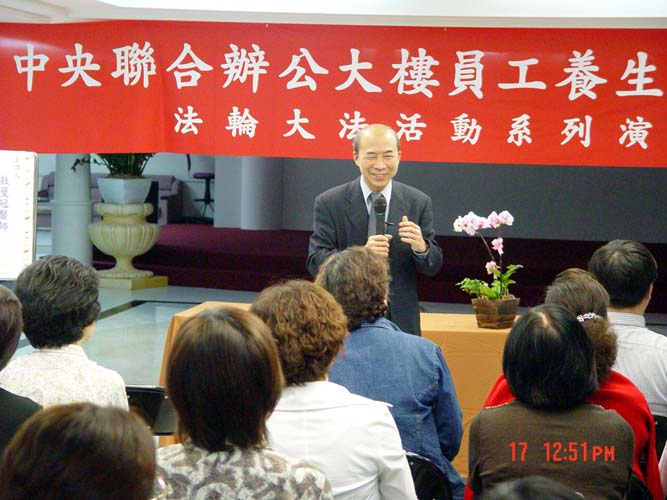 从美国及阿根廷回来的华侨来此洽公,看到法轮功学员炼功景象,很惊讶在台湾政府单位可以炼功。他们都说知道法轮功,在美国也很受欢迎,也曾参加法轮功学员张清溪教授在美国的演讲。那位阿根廷华侨询问在阿根廷当地有法轮功吗?学员告知阿根廷刚于3月7日举行了法轮大法修炼心得交流会,并将法轮功简介送给他,他非常兴奋地接受。